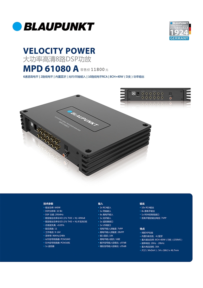 德國(guó)(藍(lán)寶BLAUPUNKT)大功率高清8路DSP功放 MPD 61080 A